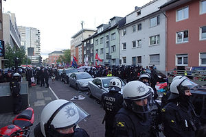 Die Demonstration fand mit ca 3000 Teilnehmer*innen unter dem Eindruck der fortschreitenden Militarisierung Deutschlands sowie der EU und der teilweisen Wiedereinführung der Wehrpflicht in Deutschland im Kölner Grüngürtel statt.