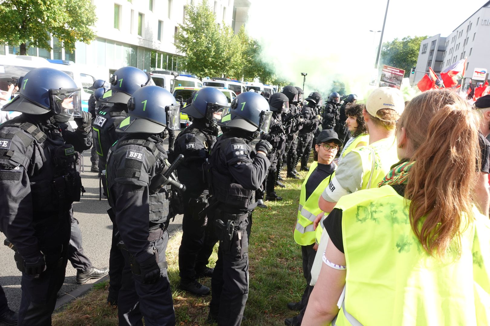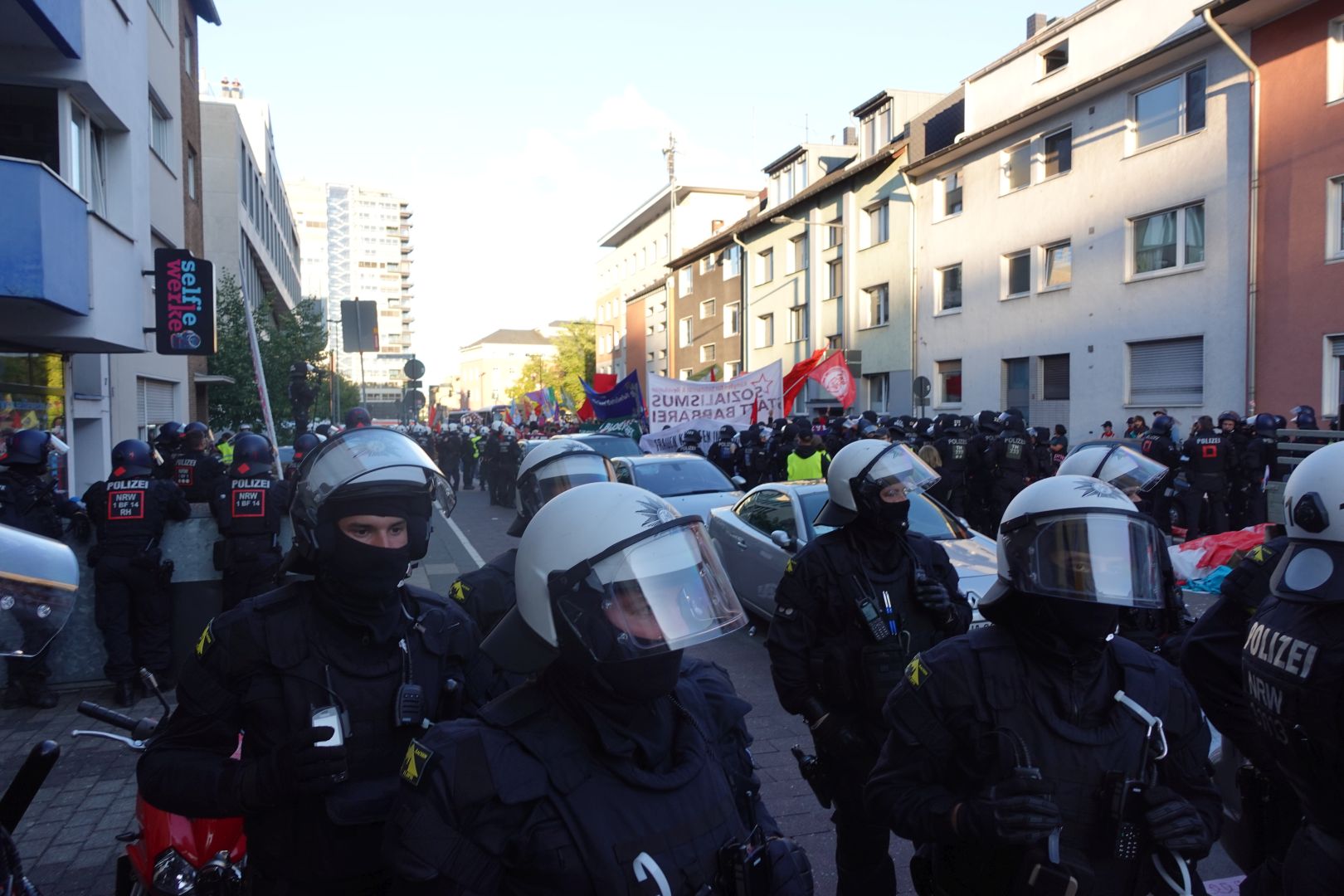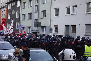 Ihr vorläufiges Ende fand die Demo bereits vor dem Erreichen der Zwischenkundgebung. In einer engen Seitenstraße entschied die Polizei, die Demo anzuhalten und den Teil des „Rheinmetall-Entwaffen“ Camps vom Teil des „Kölner Friedensforum“ abzuspalten und einzukesseln. Ohne jegliche Kommunikation mit der Versammlungsleitung, griff die Polizei die Versammlung an und nahm einzelne Teilnehmer*innen fest. Die Polizei trennte die Demo unter dem Einsatz massiver Gewalt und veranlasste die Durchsuchung des Lautsprecherwagens vom „Rheinmetall-Entwaffnen“ Demoblock. Durch den folgenden Gewaltexzess der Polizei unter Einsatz körperlicher Gewalt und Pfefferspray kam es zu über 50 Verletzten.