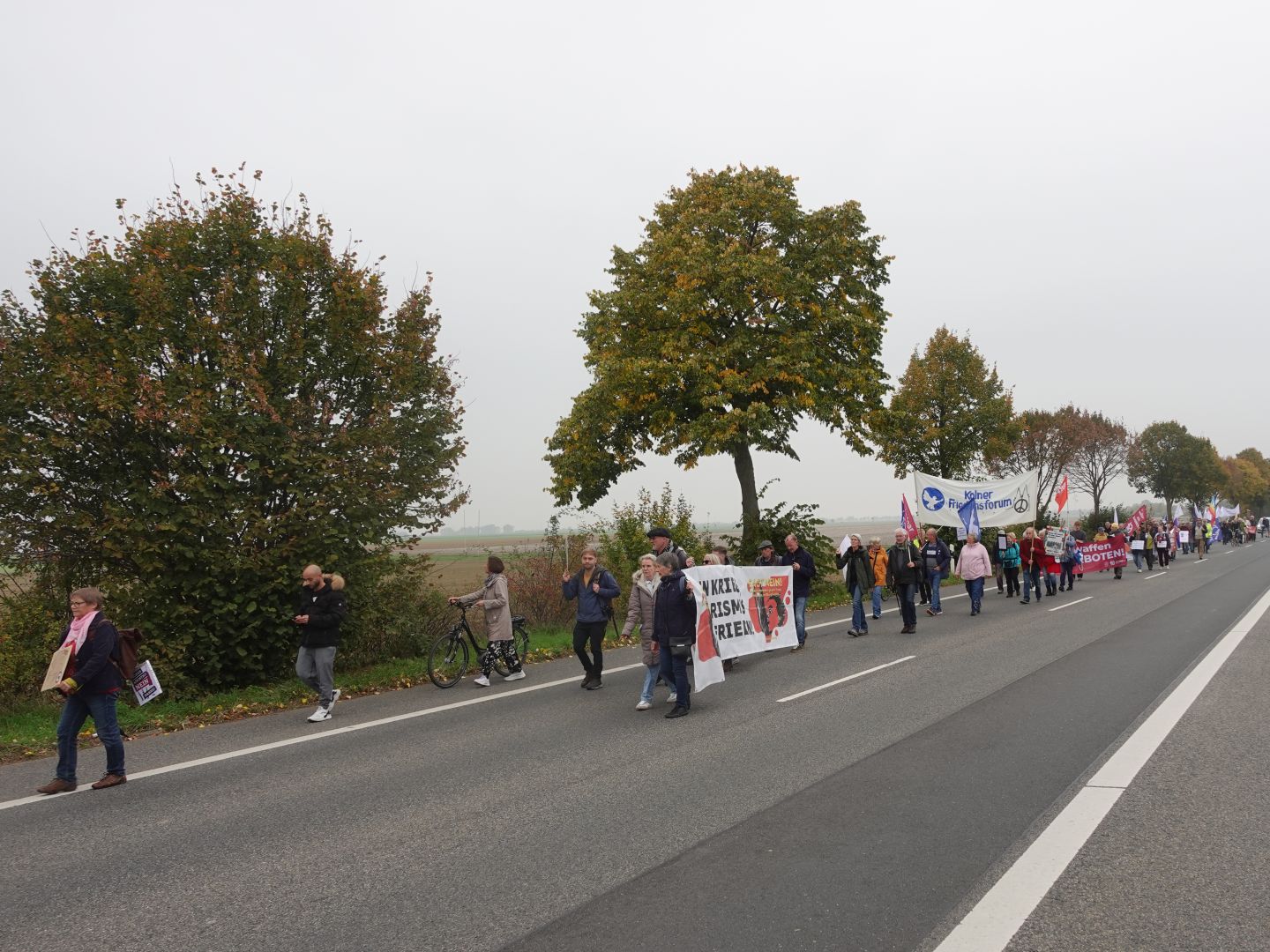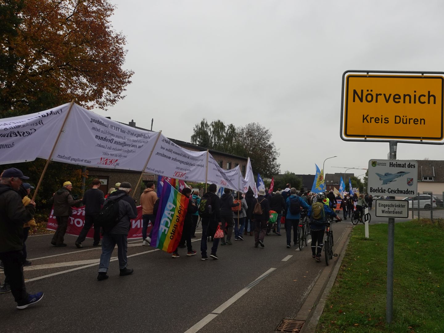 Rund 150 Menschen sind dem Aufruf von Friedensgruppen gefolgt und haben am 11.Oktober 2025 an der Demonstration in Nörvenich teilgenommen. Diese richtetet sich gegen das ab nächste Woche beginnende NATO-Atomkriegsmanöver „Steatfast Noon“. An der Kriegsübung mit Schwerpunkt am niederländischen Atomwaffenstandort Voelkel, beteiligt sich auch das in Nörvenich stationierte Taktische Luftwaffengeschwader 31 „Boelcke“ mit 3 für den Abwurf von Atombomben konzipierten Tornados und 4 Eurofighter. Die Demonstranten forderte unter anderem den Abzug aller Atomwaffen aus Deutschland und die Ächtung der Atomwaffen weltweit.