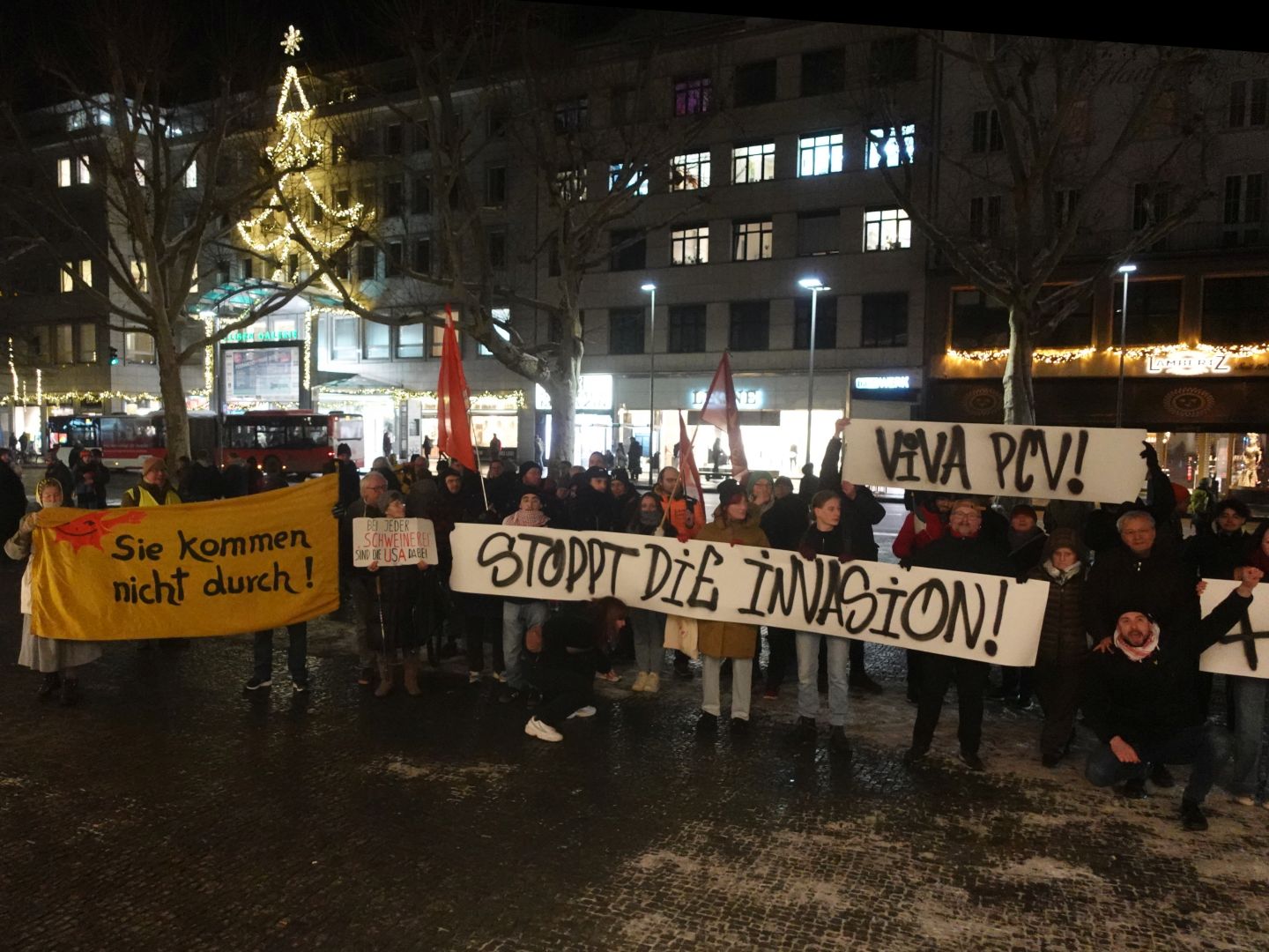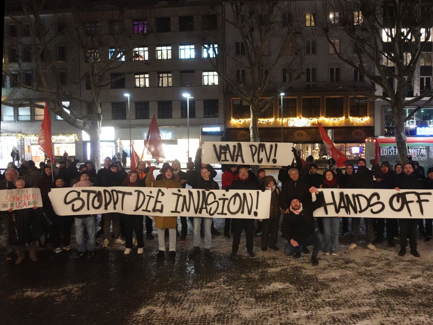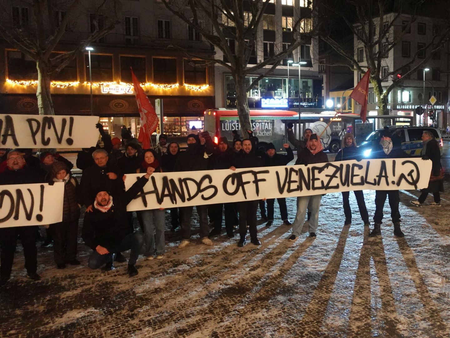 Am Dienstag, den 06.01.2026 haben sich in Aachen ca 80 Menschen am Elisenbrunnen versammelt um gegen den völkerrechtswidrigen Angriff der USA auf den souveränen Staat Venezuela und die Festnahme und Entführung des rechtmäßigen Präsidenten Maduro zu protestieren.