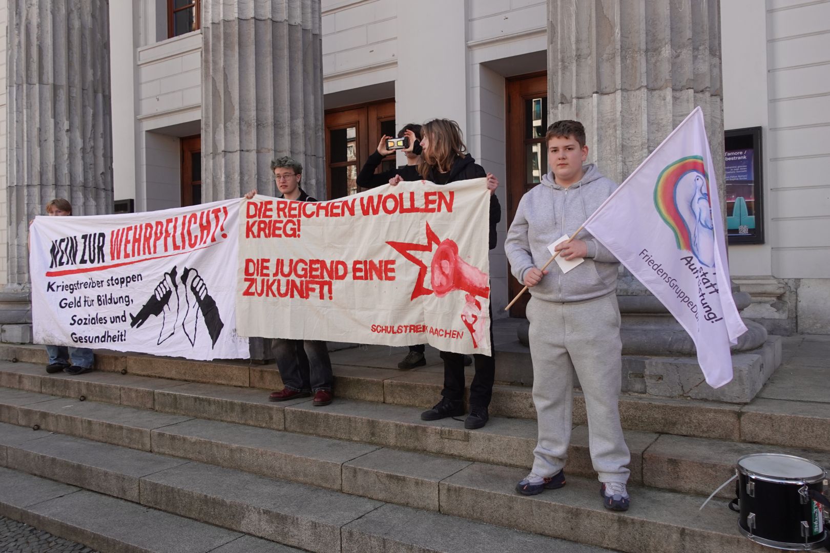 Eine wiederkehrende Parole war: »Die Reichen wollen Krieg, die Jugend eine Zukunft!« Auch die Forderung »Kein Mensch, kein Cent der Bundeswehr« wurde mit Enthusiasmus gerufen. Auf den selbstgebastelten Schildern und Bannern waren Sprüche zu lesen wie »Sterben steht nicht auf dem Stundenplan«, »Friedrich Merz an die Front!«, »Unser einziger Kampf ist der Klassenkampf« und »Bildung statt Musterung«. In mehreren Redebeiträgen wurde auf den Widerspruch zwischen der milliardenschweren Hochrüstung der Bundeswehr und dem kaputtgesparten Bildungssystem hingewiesen.